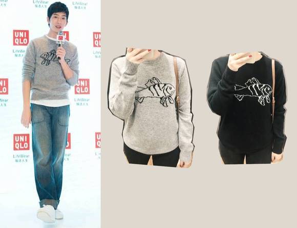 另一款是针织衫,男女都能穿,上面也有简笔画。它是纯羊毛,版型也还不错,上身有点扎人。灰色是井柏然同款,但我试了有点显土,反而黑色的更时髦。