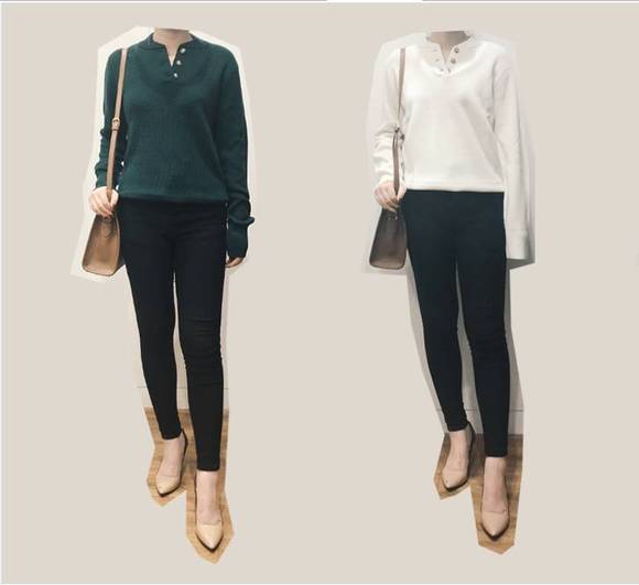 还有一件也是套头针织,有点类似polo衫,穿的时候最好把纽扣解开。look book里有拿前面那件蝴蝶结针织衫搭,用的也是同色系法则。我试了下真的很好看。但是两件毛衣上身,估计胳肢窝会有点没法舒展...