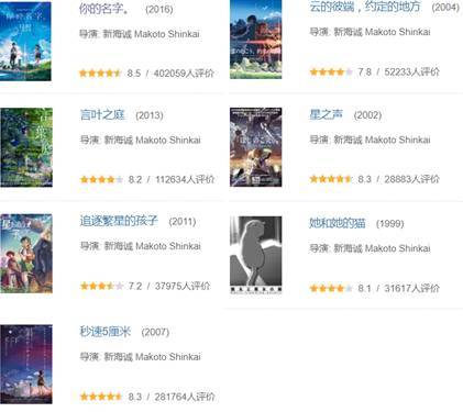 我们细数了新海诚自1999年起担当动画导演推出的影片共7部(见下图,不包括期间推出的动画广告与公益短片):