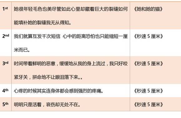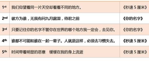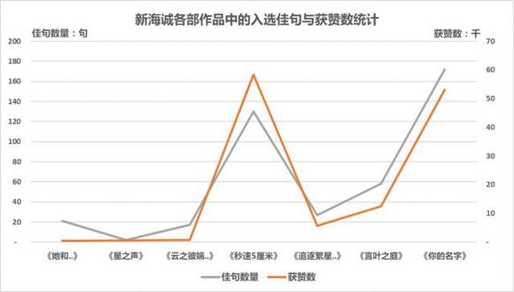 作为豆瓣得分最高的两部作品,《秒速5厘米》与《你的名字》分别贡献了130与172句著名台词,获得网友点赞数更是分别高达58,277与53,079,超过了网友总点赞量的85%,由此可见,在中国影迷的心中,这两部作品的分量还是举足轻重的。