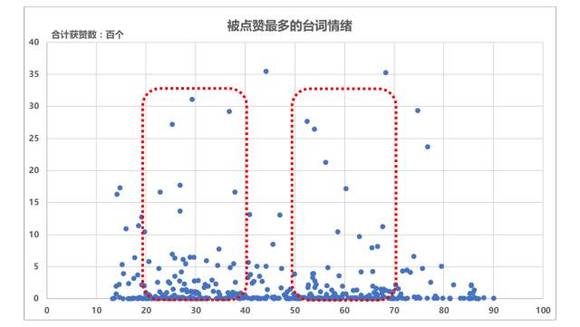 如果说《你的名字》的两句台词中流露出了宿命与决意,那么《秒速5厘米》的字里行间,则是满满的遗憾与错过。打动你我的从来都不是皆大欢喜与无病呻吟,而是那些清浅的“幸福”与厚重的“遗憾”。我们用语忆的人工智能技术对所有网友遴选的电影台词进行了情绪分析与打分,按0-100计分,分数越低,情绪越低落。下图列示了所有网友点赞评论在各情绪维度间的分布: