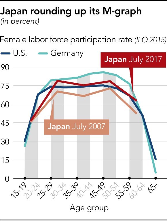 女性就业的增加也让日本就业市场出现了“历史性的结构变化”。传统上,日本很多女性进入30岁左右会因为结婚和生育而退出劳动力市场,并在45岁后重新进入职场,因此,日本女性劳动参与率图表呈M状,而不是像其他发达国家那样相对平滑的半弧形。