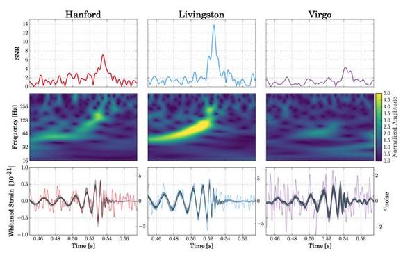 两个黑洞质量分别是30.5和25.3个太阳质量,合并后的质量约为53.2个太阳质量,也就是说,在极短的时间之内,大约有2.6个太阳质量以引力波的形式损失掉了。通过整个持续了大约0.25秒的波形振幅拟合,我们由此可以推断,此次双黑洞合并发生之处距离我们大约18亿光年。