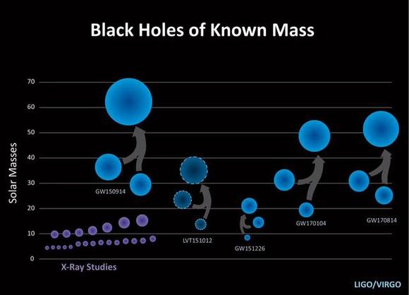 (紫色为电磁X射线波段发现的黑洞,蓝色为引力波发现的黑洞)。