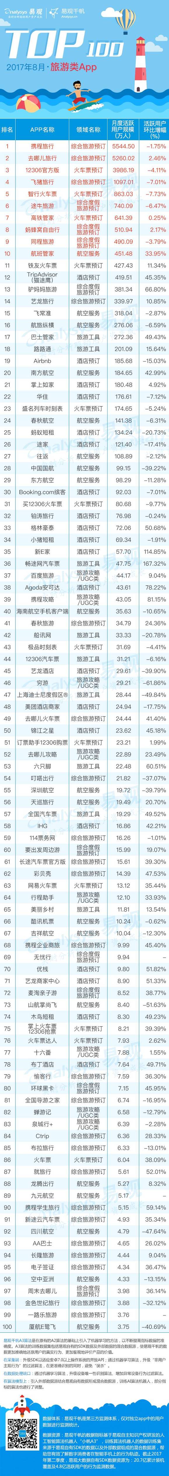 基于易观千帆8月最新移动应用大数据,我们根据月度活跃用户规模来编制排行榜单和分析解读,入围的旅游类App TOP100的榜单。