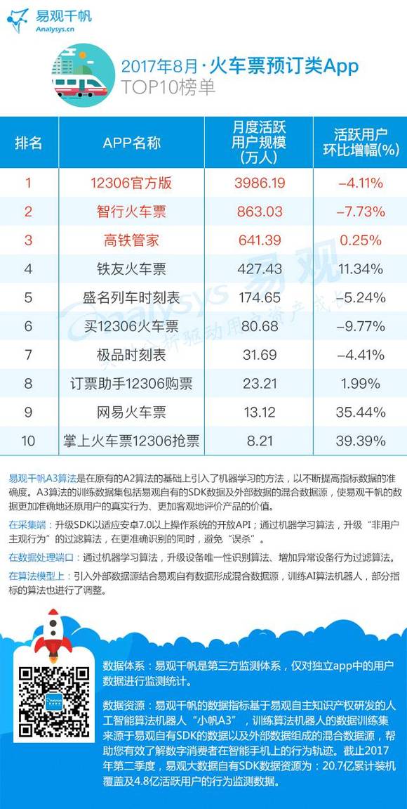 火车票预订类App TOP10榜单