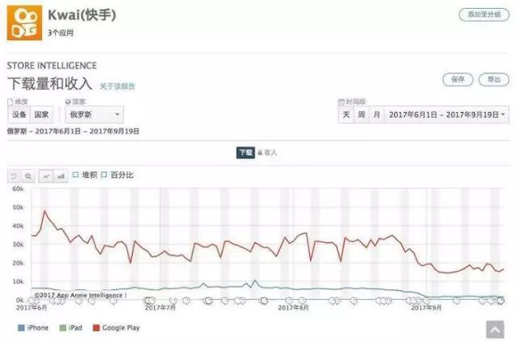 根据PingWest品玩报道:快手今年5月进入了俄罗斯,目前其海外用户,俄罗斯用户最多,占31%。但快手在俄罗斯的发展并不顺利,在App Store俄罗斯摄影与录像类榜单中的排名,已经由原本的第4名到现在跌出前45。快手俄罗斯版Kwai在Google play中已跌至2万以下,iPhone版则彻底跌入谷底。