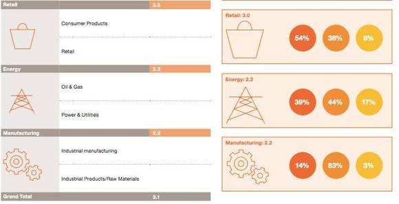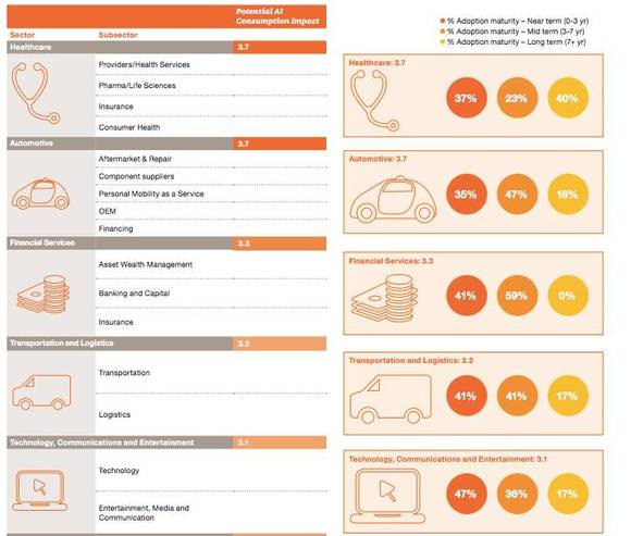 AI影响评分从1-5(1是最低的影响,5最高),医疗和汽车都是3.7分,并列第一: