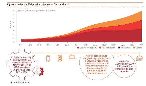普华永道最近发布了一份名为“探索AI革命”的全球AI报告,报告认为,到2030年,AI将为全球经济贡献高达15.7万亿美元,比中国和印度目前经济产值的总和还多。AI带来最大经济收益的国家将是中国(2030年GDP增长26%)和北美(14.5%),相当于10.7万亿美元,占全球经济影响的近70%。