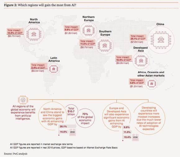 AI带来最大经济收益的国家将是中国(2030年GDP增长26%)和北美(14.5%),相当于10.7万亿美元,占全球经济影响的近70%。