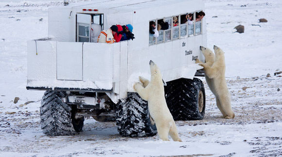 什么吸引中国游客:“我们的苔原车沿着哈德逊海湾行驶,饥肠辘辘的北极熊早已分散于沿岸各处,玩闹、打斗、在雪地里打滚,旅行者们可以在特制的苔原车上近距离且绝对安全地欣赏它们。”探险公司的Brandi Hayberg向记者口述了诱人的观熊之旅。
