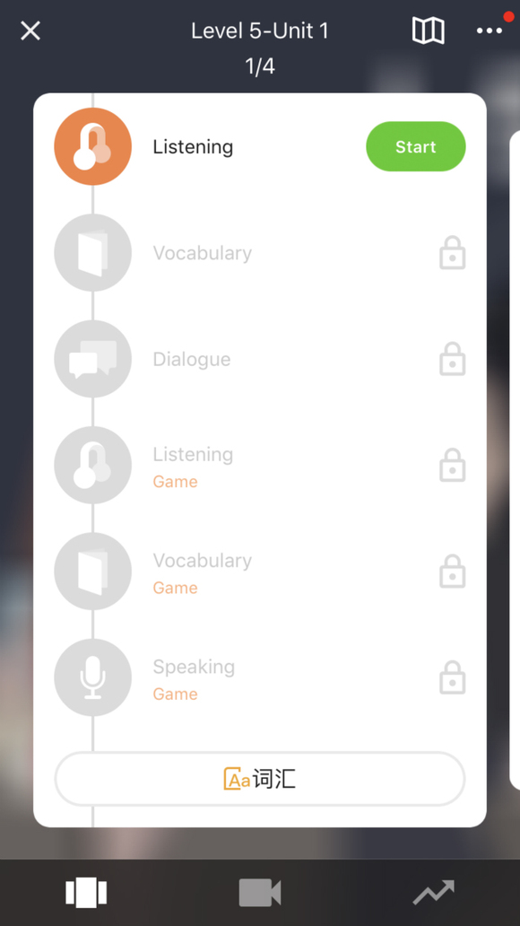 做完采访后,我正式开始了英语流利说付费课程的体验。每一个级别共有三个单元的课程,每个单元有四张卡片,每张卡片共有6节课,包括听力(Listening)、词汇(Vocabulary)、对话(Dialogue)及对应的三个游戏模块。同游戏升级打怪一般,每答对一道题,用户可以积累金币,金币的数量对应每节课的得星数量,只有前一张卡片每节课至少获得一颗星,第二天才可以解锁下一张卡片。英语流利说对用户的要求是每天至少学习30分钟,每周至少学习5天。系统会实时统计数据,告诉用户当下的学习进展和技能水平。