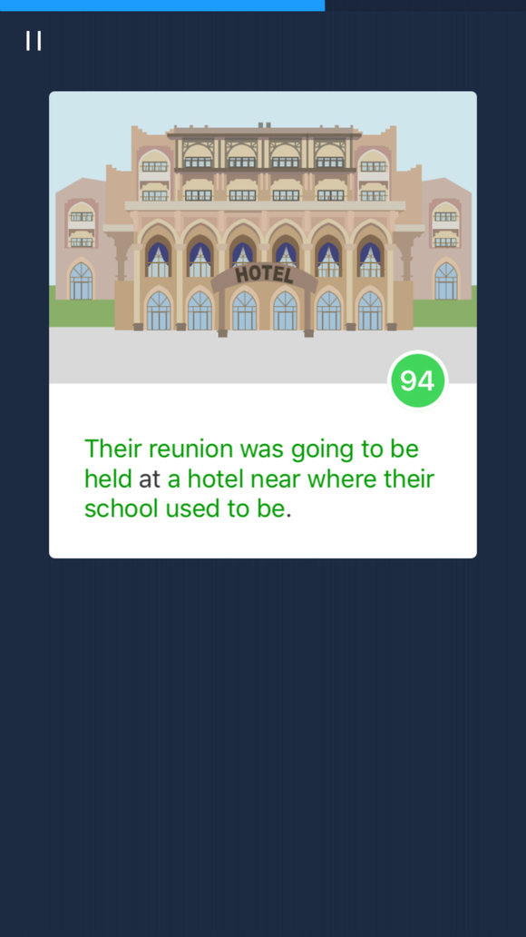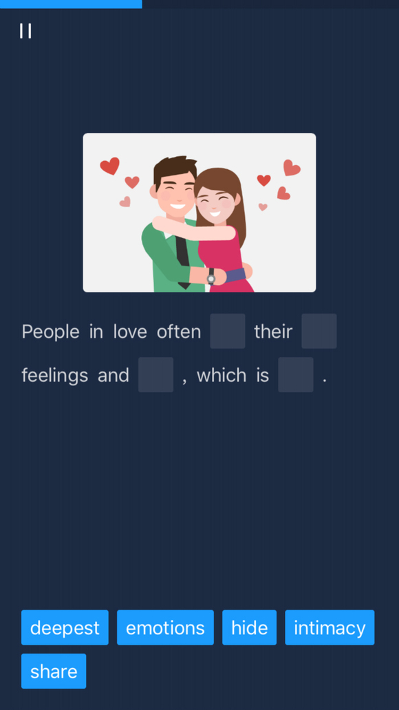 课程的展开形式的确和测试很像。以旨在扩充用户词汇量的“词汇”课为例,系统会首先显示单词,然后以图说的形式给出包括这个新词在内的若干个例句,然后出完形填空、跟读句子、选择题、听读句子等题目来巩固用户对新词的理解和应用。在完成听力、词汇和对话课后,三个游戏模块基本上就是帮助用户复习学习过的内容,之前听过的段落会对话会反复出现,以各种题型加深用户的记忆。
