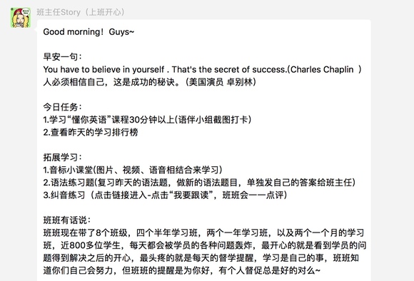 为了弥补纯线上课程缺乏真实互动感的问题,英语流利说设置了微信群制度,由真人员工担任“班主任”,每日在微信群里指导用户音标、语法和纠音练习,并定期召开线上班会,集中回答用户在一段时间内的学习疑问。用户也可以给班主任发私信,寻求一对一的帮助。不过在知道我的“班主任”带着8个班级近800位学生,每天会被学生的各种问题狂轰滥炸时,我不禁为她心疼三秒钟。另外,用户被要求组队建群,每日在群中发当天课程完成30分钟以上的截图。如果全队成员在一段时间内都保持良好的记录,将获得特殊课程免费的奖励。
