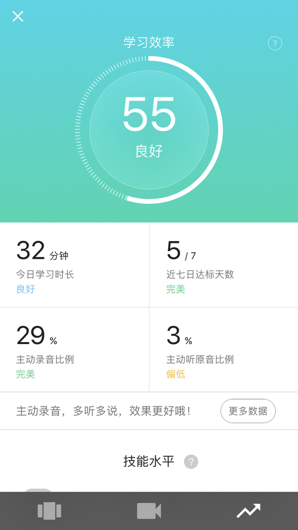 因为课程中出现的新词都是我熟知的词汇,所以我没有什么在学习新知识的感觉,但可以想象初级用户在刚开始学习“懂你英语”的时候会不适应——既不出现文字,也没有中文注释,完全要依靠听觉、视觉和联想能力来在具体语境下加深对新词汇的印象,然后通过朗读和听读验证学习效果,这的确和我们习以为常的英语课太不一样了。但我也确实在学习过程中发现了自己的薄弱环节:有些时候我会在听读的时候没能做到完整准确地说出句子,问题往往出现在丢失了某个介词,这实际上是反映了我的语法熟练程度不够。在系统数据统计中,语法也的确是我得分最低的部分。