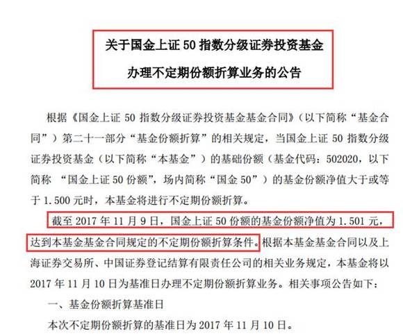 9日晚间,国金基金在上交所发布公告,旗下国金上证50指数分级基金(以下简称国金上证50)触发向上不定期折算,该分级基金母基金单位净值达到了1.500元的折算阈值。