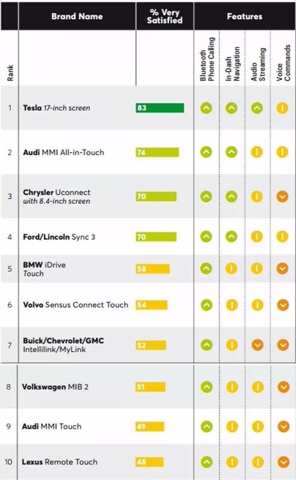 特斯拉有大屏幕按钮,清晰的文图,快速的反应,合理的布局,有效的各类互联网应用以及搜索,满意度也最高。