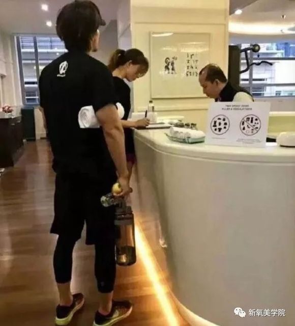 林志玲和言承旭被拍到一起去健身房,言承旭站在一边,林志玲在柜台签名。