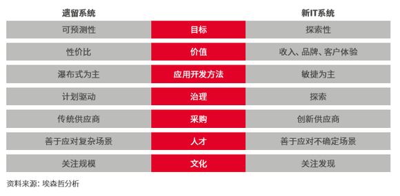 由于遗留系统与新IT系统在目标、治理、采购等方面的差别,也让试图融合这两类系统变成了几乎不可能完成的任务。毕竟,这不是造房子,不是简单的破旧立新就可实现。