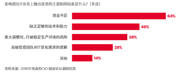 此外,资金不足也影响了IT系统对数字化转型的支持。不过,首席信息官们也认为,这是一个伪命题——革新IT系统虽然前期投资巨大,但节省下来的资金更可观,这笔费用足以覆盖IT系统转型的投资。