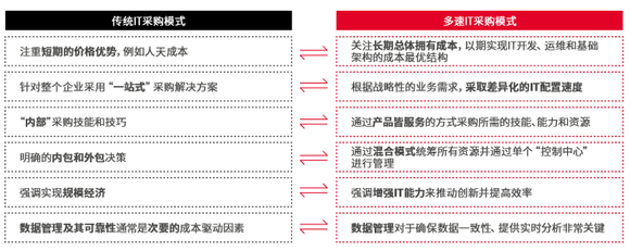 传统IT采购模式下,企业追求短期的价格最优,而多速IT采购模式下,更关注长期、整体的技术拥有成本,从而实现IT开发、运维和基础架构的成本最优结构。