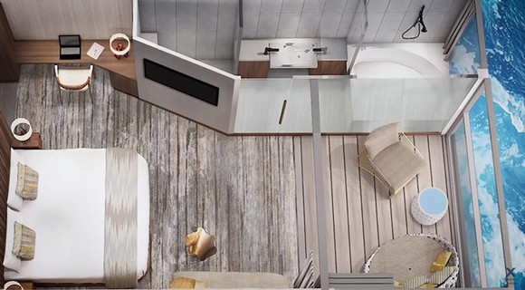 Flora的内部打造的十分精致。客房内的床将全部面向大海,连盥洗室的浴池也有一面透明玻璃与海相连,装饰材料都是自然和有机的。