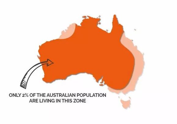 虽然澳洲面积很大,但是人类居住的区域很小。下面广阔的深黄色地区只有2%的人口居住: