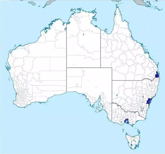 下面这些深蓝色的区域居住着澳洲50%的人口,能猜到它们是哪些城市吗?
