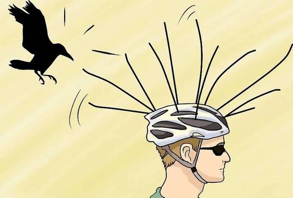 不想在骑行时被喜鹊骚扰?很多人选择在头盔上缠绕一些色彩明亮的塑胶带,“老司机”表示很有效果,据说这样可以扰乱鸟儿的注意力: