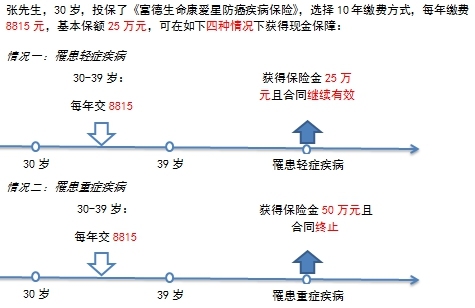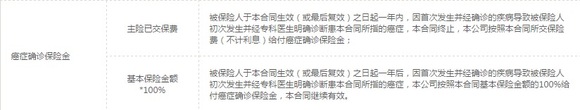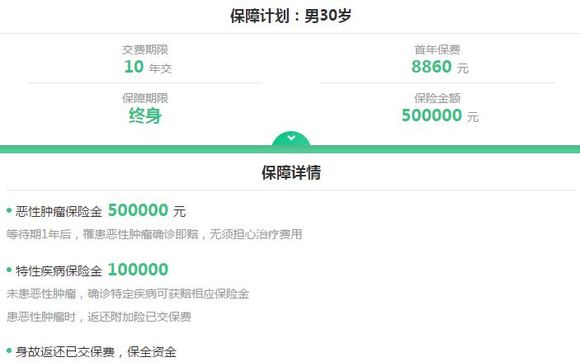 同为30岁男性 ,10年期缴费投保50万恶性肿瘤保障,每年需要缴费8860元,比“康爱星”高出45元,10年总计多交450元。更需要留意的是,“**爱无忧保障计划”轻症保额仅有10万元,仅为恶性肿瘤保险金的20%,与“康爱星”的25万相去甚远。“**爱无忧保障计划”的轻症保障是附加险,如果被保险人未在轻症阶段发生理赔,而是直接在恶性肿瘤期间理赔,则返还轻症保费310元/年,总计返还3100元。为了自己的身体着想,小编还是建议大家早发现早治疗,不要为了这3100元的返还而耽误了病情,毕竟轻症的治愈率比恶性肿瘤高太多。