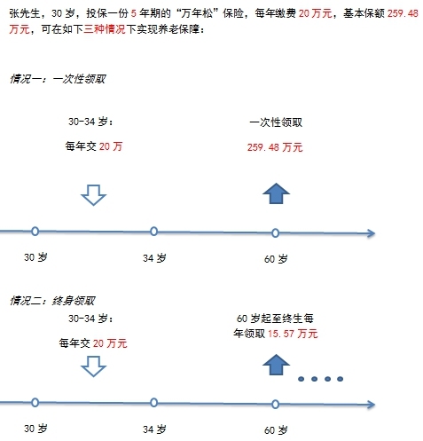 “万年松”养老年金保险拥有十分灵活的缴费方式,客户可以选择趸交或者分3、5、10年缴费。同样灵活的还有其年金领取方式,投保人可以根据自身资金需求和资产配置安排选择一次性领取养老金或者分年领取,灵活性远好于同行业产品。