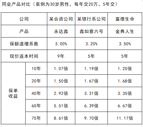 从保额递增系数来看,某合资公司的“永达鑫”为3.0%,某银行系公司的“鑫如意六号”为3.2%,而富德生命人寿的“金典人生”则高达3.5%,是几款产品里最高的。这意味着,长期来看,“金典人生”的收益最理想。保单收益的体现就更为直接了,“金典人生”是三款产品里保单收益最高的,时间越长,差异越明显。75年的时候,“金典人生”的保单收益高达11.17倍,同时间的永达鑫仅为8.61倍,鑫如意六号也不到10倍。