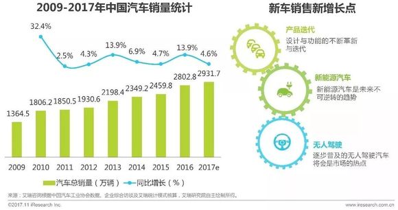 中汽协数据显示,2009年以来我国新车销量保持井喷之势,连续多年居世界第一位。结合公开数据,艾瑞分析认为,2017年新车销量将达2931.7万辆;