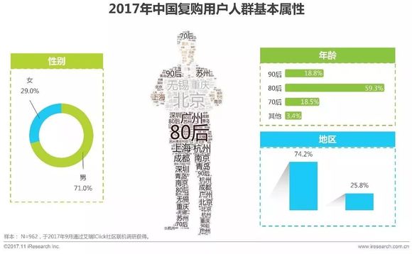 调研数据显示,复购用户以男性用户为主,占整体用户数量的71%;在地域分布上,复购用户集中在一二线城市,用户比例高达74.2%;其中接近六成用户是80后,是人群最主要构成。90后用户占比超越70后用户,且未来上升潜力较大。