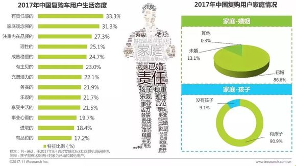 调研数据显示,复购用户中接近九成用户已婚且有孩子;在生活态度上,复购用户最明显的特征有家庭观念强、责任感强、有主见、成熟理性、乐观享受生活且积极进取。