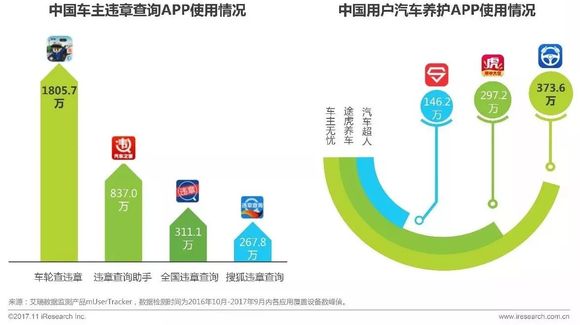 艾瑞监测数据显示,查违章应用类APP中,车轮查违章以1805.7万的设备覆盖量高居首位;在汽车养护类APP中,车主无忧以373.6万设备覆盖量位居第一,途虎养车、汽车超人等应用紧随其后。