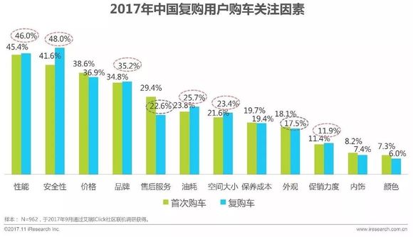 调研数据显示,首次购车用户最关注的是车辆性能因素,复购用户再次购车则最关注车辆安全性因素;复购用户再次购车对价格、售后服务以及外观关注度有所降低,对品牌、车辆空间及排量大小关注度略有提升;