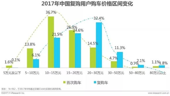 调研数据显示,复购用户再次购车的车辆价格区间集中度相比首次购车有着明显的变化,首次购车车辆价格区间集中在10-15万元,而再次购车的车辆价格区间集中在20-30万元。