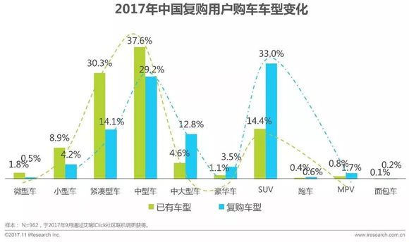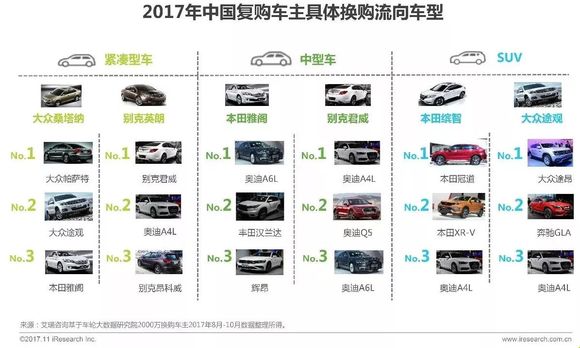 数据显示,紧凑型车主换购首选为中型车,而中型车换购会转向中大型车及同级别的豪华品牌车辆;SUV则倾向换购中大型SUV或购买豪华品牌车辆;整体分析,各车型对SUV的需求都在提升。