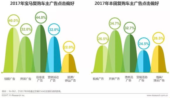 调研数据显示,车主对于广告的喜好各有差异,宝马复购车主偏好点击信息流广告及视频广告;而本田复购车主则更喜欢点击开屏广告、信息流广告。信息流、开屏及视频广告形式也是当前主要的广告投放形式。