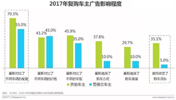 调研数据显示,车主受广告影响程度有明显差异,其中超三成奔驰车主看完广告后,甚至改变了购车目标;相比雪佛兰车主则只有5%;另外,奔驰车主在广告后对于车辆配置、车型再次进行对比的比例均高于雪佛兰车主。