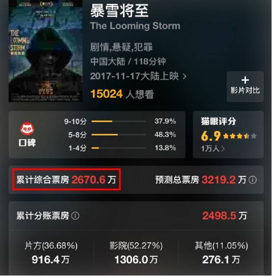 11月15日在《暴雪将至》的北京首映礼上众星云集,多位知名导演演员在网络上为这部“年度最佳之一”打电话,也受到了豆瓣评分7.2分的颇高评价,但就上映十天的票房来看,可谓“暴雪遭遇暴雪”。