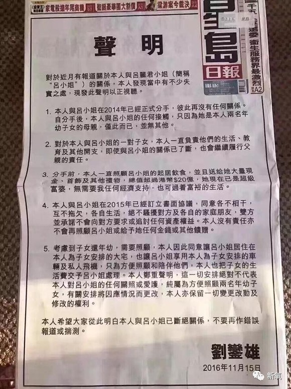 2016年11月15日,刘銮雄发布声明,宣告与吕丽君情断分手~至此甘比赢得了胜利。