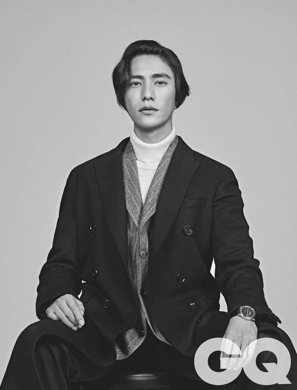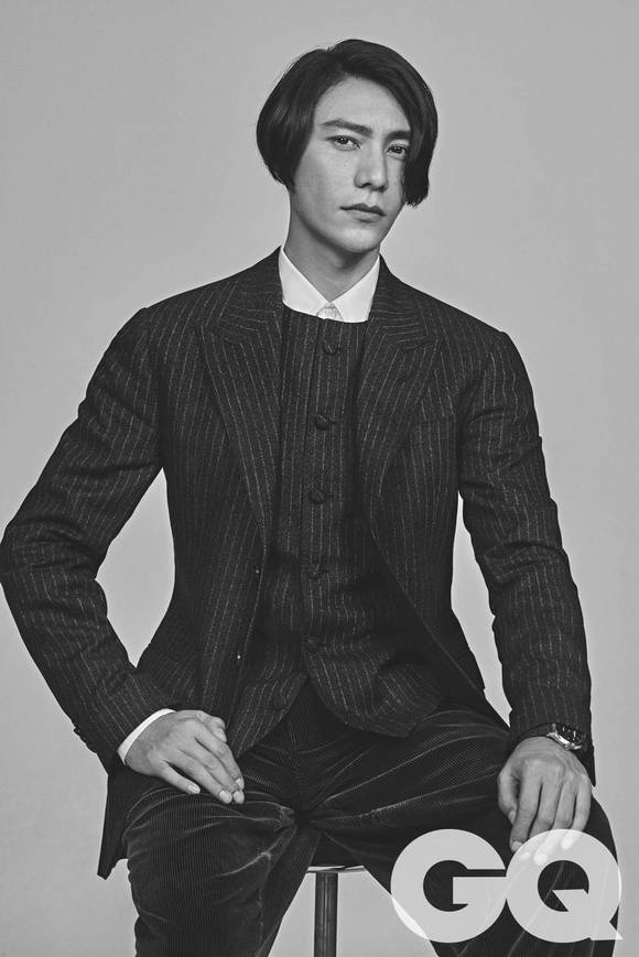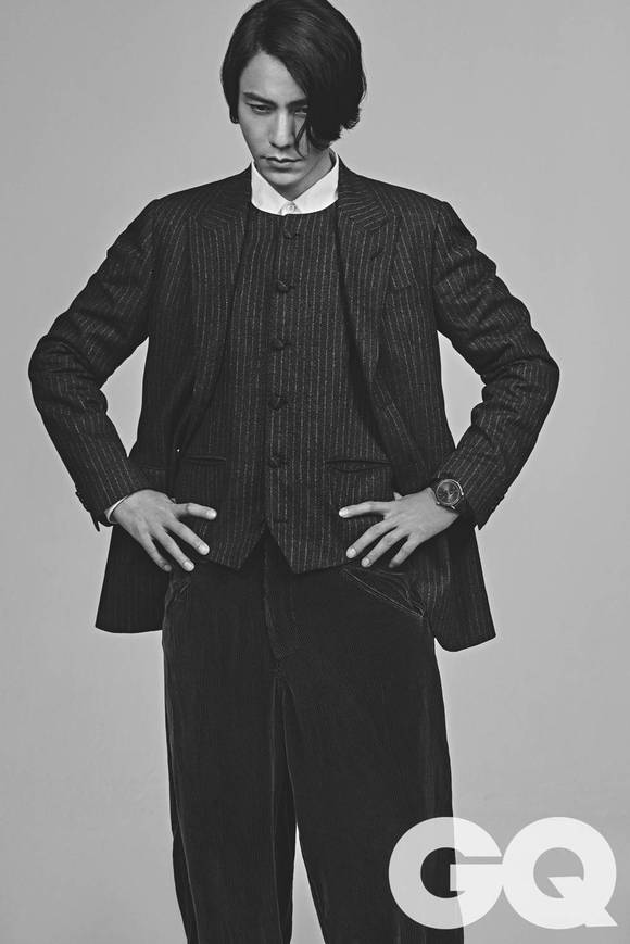 深灰色条纹西装上衣 深灰色马甲 均为 Cerruti 1881 白色衬衫 Burberry 墨绿色灯芯绒长裤 Giorgio Armani “恒久之玄”陈坤特别款10386腕表、搭配臻品羊毛表带 Baume &Mercier