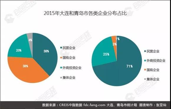 产业模式的不同使两个城市企业聚集特征也存在不小差异,中国指数研究院总结了大连和青岛2015年各类企业分布的占比,发现:大连国有企业数量多,青岛民企经济发展更活跃。大连受到前期重工业发展影响,国有企业占比达到近40%,高于青岛的35%。