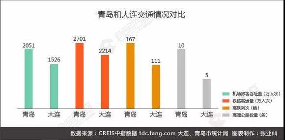 2016年民航机场吞吐量排行中,青岛和大连排名中等偏上,分别位列第16和22位,青岛较大连优势稍有凸显;两市同属于铁路端头城市,铁路客运量均在两千万人次水平,青岛和大连通车高铁线路分别为167条和111条,青岛同样略胜一筹。
