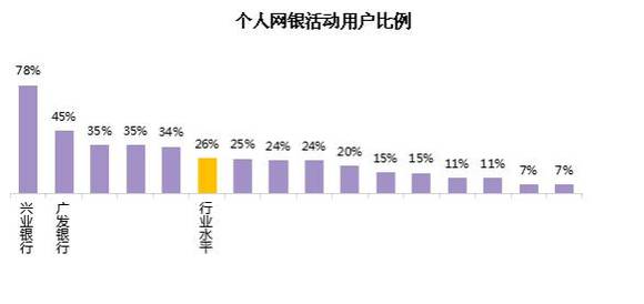 个人网上银行活动用户比例平均为26%,各行中最高为78%,最低为7%,有5家银行的个人网银活动用户比例较高,好于行业水平。