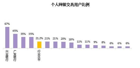 个人网上银行交易用户比例平均为21.2%,各行中最高为67%,最低为6%,有4家银行的个人网银交易用户比例较高,好于行业水平。