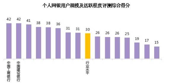 个人网银用户规模及活跃程度评测结果显示,行业平均得分为30。各家银行中,最高分为42,最低分为15,有8家银行的得分高于行业水平。