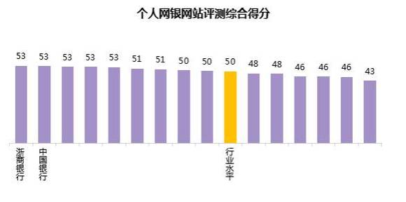 个人网银网站评测主要从网站建设和网站性能两个方面进行评价。个人网银网站评测结果显示,得分的行业水平为50。各行中,最高分为53,最低分为43,有9家银行的得分高于行业水平。